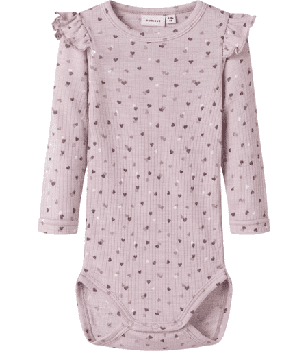 Name It Nbfwomi body i ull/modalNydelig body i en utrolig myk ull/modal-mix. Bodyen har hjerteprint over hele og volanger over skuldrene.Materiale: 60% Ull (merinoull), 40% Modal ...