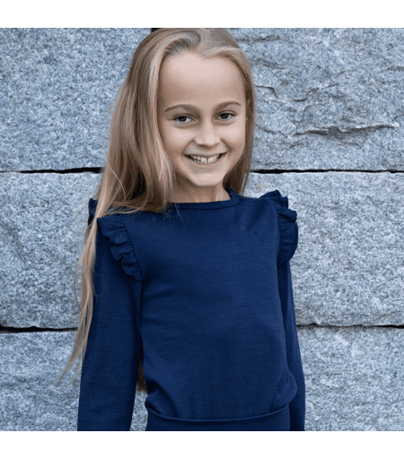 Vilje & Ve Dis genser i ull/bambusDis er en enkel ullgenser med søte volanger ved skuldrene. Genseren har rund hals og kommer i en klassisk marineblå fargeMateriale: 50% merinoull, 45% bambus av viscose, 5% Nylon ...