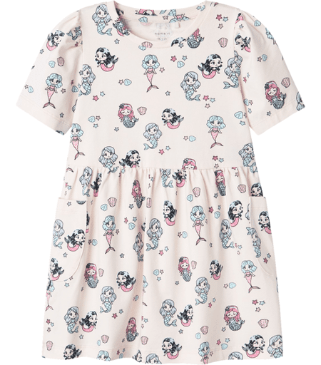 Name It Nmffenja kjole til småbarnSøt kortermet kjole til småbarn i myk bomull. Kjolen har print av havfruer over hele og har snitt i midjen.Materiale: 95% Bomull, 5% Elastan ...