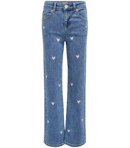 Kids Only Kmgjuicy Wide Leg jeans til barnKule jeans til barn og ungdommer med vide ben og broderte hjerter over hele. Buksen har lommer foran og bak og er lett å style.Materiale: 98% Bomull, 2% Elastan ...