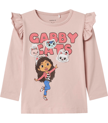 Name It Nmfjutte Gabby's genser til småbarnSkjønn genser til småbarn i mykt jersey-materiale. Genseren har stort Gabby's dukkehus print foran og har volanger over skuldrene.Materiale: 95% Bomull, 5% Elastan ...