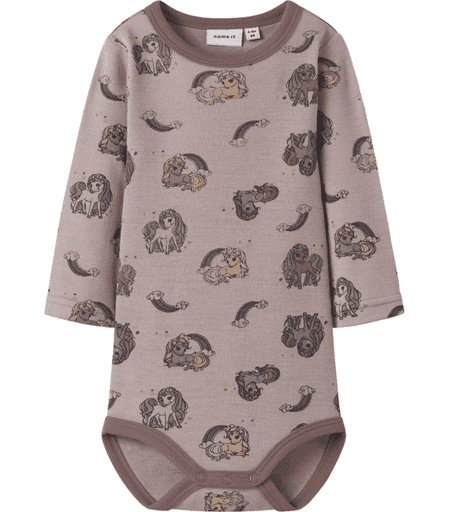 Name It Nbfwillit body i ullNydelig body i myk merinoull. Bodyen har print av enhjørninger og har kontrastfarge i sømmene.Materiale: 100% merinoull ...
