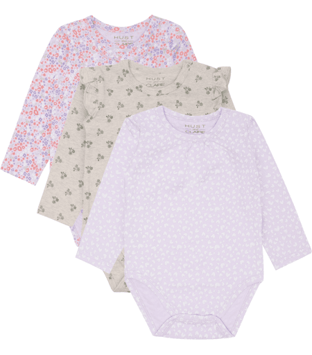 Hust and Claire Hcbella 3-pack body3-pakning med langermede bodyer i 3 forskjellige design: En med blomstertrykk og volanger over skuldrene, en med blomstertrykk og volanger ved halsen, og en med hjertemønster og rynker på brystet. Alle tre design kneppes på venstre skulder og mellom bena.Materiale: ...