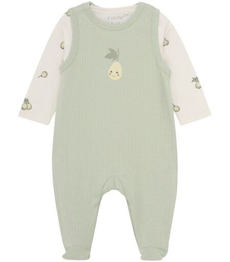 Fixoni body og romper settSett med sparkedrakt og body fra FIXONI. Sparkedrakten er ensfarget med print på brystet, har føtter og lukkes med trykknapper ved halsåpningen og mellom bena. Bodyen under har lange ermer, heldekkende print og lukkes med trykknapper på skulderen og mellom bena.Materiale: ...