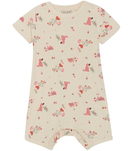 CeLaVi romper i bambus til babySøt romper med all-over print fra CeLaVi i en myk bambuskvalitet. Drakten har korte ermer og ben, og materialet er stretchy. Den lukkes med trykknapper på skulderen og mellom bena.Materiale: 67% bambusviskose, 28% bomull, 5% elastan ...