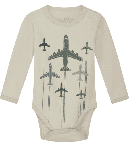 Hust & Claire ullbody til babyLangermet Hust & Claire body i myk, elastisk ull- og bambuskvalitet med fly-print. Kneppes på venstre skulder og mellom bena.Alt stoff som treffer huden er i bambus, slik at plagget også passer barn med sensitiv hud.Materiale: 50% ull, 45% Viskose av bambus, 5% ...