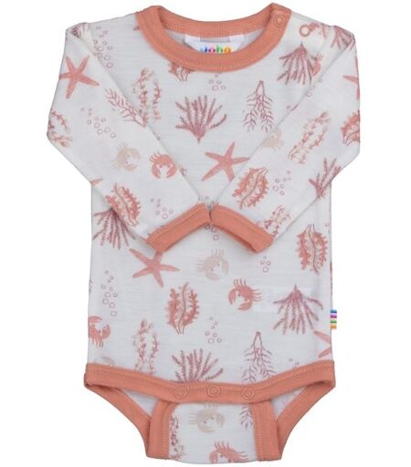 Joha Aqua Flora body i sommerullLangermet body med sommerlig print. Den har trykknapper på den ene skulderen og mellom bena for enkel påkledning. Laget av en myk og lett ullkvalitet med god stretch som er behagelig å bruke som innerplagg. Sertifisert i henhold til Oeko-Tex 100-standarden.Materiale: ...
