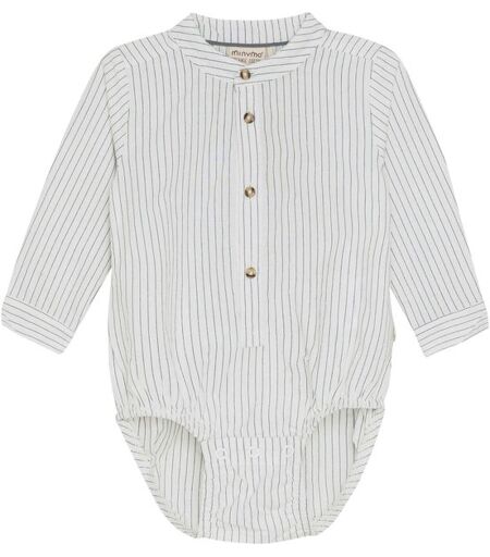 Minymo skjortebodyFin stripete langermet skjortebody fra Minymo. Bodyen er vevd i en bomullsblanding og har en fin detalj på baksiden. Den lukkes med trykknapper mellom bena, samt knapper foran og ved håndleddene. Sertifisert i henhold til GOTS - organic CERES-0366.Materiale: 100% bomull ...