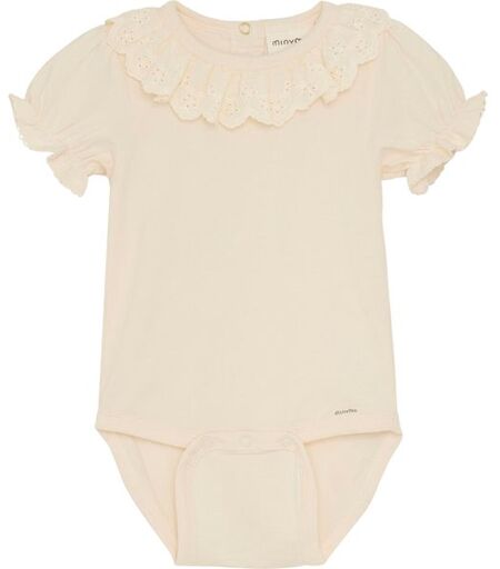 Minymo kortermet body m/krageSøt ensfarget kortermet body fra Minymo. Bodyen er laget av en myk og komfortabel bomullsblanding og har en vakker brodert krage som gir et pyntet preg. Delikate hekledetaljer og elastikk ved ermene gir et ekstra fint uttrykk. Lukkes praktisk med trykknapper bak og ...