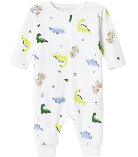 Name It Dino pyjamas/heldressSøt pyjamas til de aller minste i myk og behagelig bomull. Pyjamasen har print av søte dinosaurer over hele. Praktisk glidelåslukking fra topp til tå.Materiale: 51% økologisk bomull, 49% bomull ...