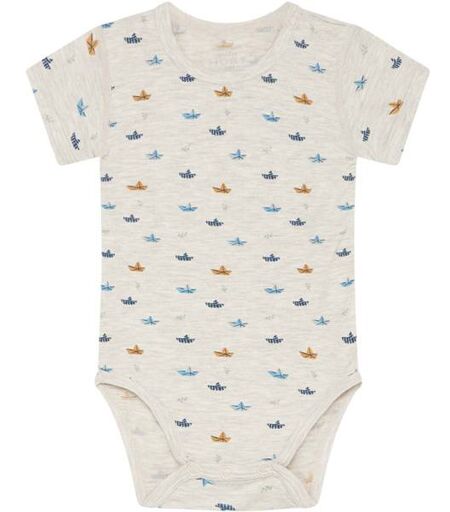 Hust & Claire Bue kortermet body m/papirbåterKortermet body i behagelig, elastisk bambusviskose med trykk av papirbåter. Modellen kneppes på venstre skulder og mellom bena. Dette produktet er Oeko-Tex 100®-sertifisert.Materiale: 95% bambusviskose, 5% elastan ...