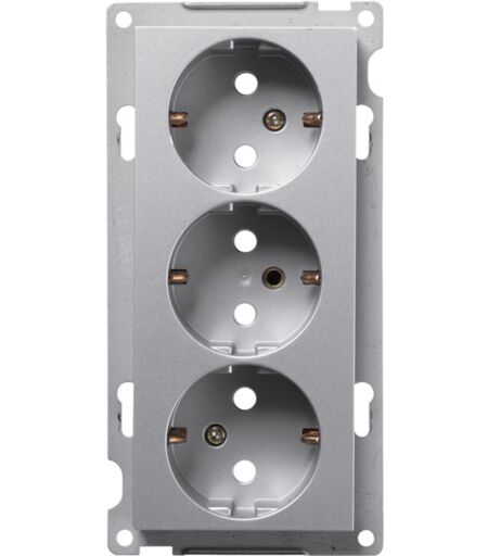 Tre veis stikkontakt innfelt med sentralplate. Leveres med barnevern og passer inn i ELKO dobbel kombinasjonsplate eller med 3-4-5 hull. Innstikkhullene er vridd 90 grader, slik at ved bruk av plugg med sideinnføring vil ledningen henge nedover. IP20. Halogenfri. Farge: aluminium. Vi er etter Forskrift om elektrisk utstyr § 21 pliktig til å informere våre forbrukere at installasjonsmateriell ment for å kunne inngå i et fast elektrisk anlegg kan kun installeres av en registrert installasjonsvirksomhet. Unntatt er elektrisk materiell som utelukkende er ment for bruk i faste teleinstallasjoner, og elektrisk materiell som forbruker selv lovlig kan installere. ...