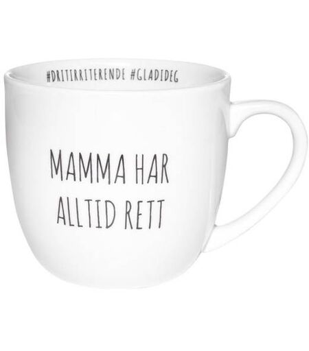 Krus "Mamma har alltid rett" er laget på den ærverdige Porsgrunds Porselænsfabrik.Hastager på innsiden av koppern #dritirriterne #gladidegNorsk håndarbeid på sitt beste. En god og stor kopp, akkurat passe tykk i porselenet til å nyte både kaffe og te av. Krus til en mamma som alltid har rett – og mammaer har jo som regel det! Til en mamma som alltid kommer med omsorgsfulle råd og løsninger, og blåser bort skrubbsår på både kropp og sinn. ...