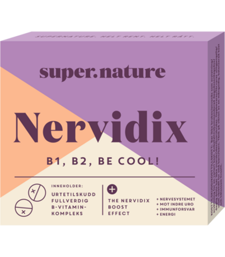 Innholdet av vitaminer og mineraler i Supernature Nervidix bidrar til normal psykologisk funksjon, kognitiv funksjon og motvirker tretthet og utmattelse. Nervidix kan derfor anbefales i en stressende hverdag. Nervidix er en av de opprinnelige urteproduktene fra Supernature, formulert av Supernatures gründer John Opsahl. Ingredienser: Kaliumkarbonat, antiklumpemiddel (cellulose, silisiumdioksid), havrespire (Avena sativa) lindeblomst (Tilla cordata), magnesiumkarbonat, insulin, sitronmelisse (Melissae officinalis), humle (Humulus lupulus), lavendel (Lavendula officinalis), maltodekstrin, sinksitrat, nikotinamid, kalsium-D-pantotenat, blomsteressenser, cyanokobalamin, mangansulfat, fortykningsmiddel (magnesiumsalter av fettsyrer), pyridoksinhydroklorid, tiaminhydroklorid, riboflavin, D-biotin, pteroylmonoglutaminsyre. Anbefalt daglig dose: 2 tabletter daglig med drikke. Start gjerne med mindre dosering og trapp opp gradvis. Ved ubehag, trapp ned doseringen eller stopp bruken helt. Nervidix kan brukes i kombinasjon med Depridix ved behov, da må døgndosen halveres til en tablett av hver.Anbefalt bruk: 2 tabletter daglig med drikke.Innhold pr. døgndose (2 tabletter).Vitamin B1 (tiamin) 2,4 mg (218 %)*Vitamin B2 (Riboflavin) 2,8 mg (200 %)*Vitamin B3 (Niacinamid) 132 mg (200 %)*Vitamin B5 (Pantotensyre) 14,8 mg (246 %)*Vitamin B6 (Pyridoksin) 4 mg (285 %)*Vitamin B12 8,8 µg (352 %)*Folsyre 200 µg (100 %)*Biotin 224 µg (448 %) *Kalium 200 mg (10 %)*Magnesium 75 mg (20 %)*Sink 12,5 mg (125 %)*Mangan 2,5 mg (125 %)*Dette produktet er et kosttilskudd og skal ikke erstatte et variert kosthold.Daglig inntak bør ikke overskride anbefalt dosering. Oppbevares utilgjengelig for barn. Innhold:48 tabletter ...