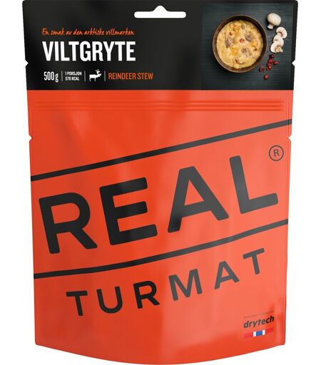 Real Turmat viltgryte er jegerenes favoritt. Vilgryta gir en smak av den arktiske villmarken med reinsdyrkjøtt, sopp og poteter i en fyldig saus. Når sulten melder seg er det bare å tilsette varmt vann, vente 8 minutter og spis rett fra posen. Ingredienser: Potet, ...