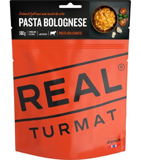 Real Turmat Pasta Bolognese er en italiensk gryterett med smaksrike urter. Når sulten melder seg er det bare å tilsette varmt vann, vente 8 minutter og spis rett fra posen. Ingredienser: Pasta (durumhvete) (36%), kjøttpudding (storfekjøtt (45%), potetmel, løk, ...