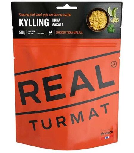 Real Turmat Kylling Tikka Masala. En eksotisk og krydret indisk-inspirert gryte med ris, ingefær og koriander. En sikker vinner hos både unge og voksne. 578 kcal pr porsjon. Vekt: Netto: 133 gram. Brutto: 150 gram. Ferdig tilberedt: 500 gram. Holdbarhet: Produktet har 5 års holdbarhet fra produksjonsdato. Lagres ved romtemperatur. Åpen pose skal behandles som ferskvare. Måltidet bør spises innen 2 timer etter at vann er tilsatt. Tilberedning: Riv av toppen på posen ved rivehakket. Tilsett 3,7 dl varmt vann til nivåmerket. Rør godt rundt, lukk posen med poselåsen og la retten hvile i 8 minutter. Ingredienser: Ris, 12% sammensatte stykker av kylling (89% kylling, salt, pepper, stabilisator (E450), 12% linser, løk, kokosmelk, 3,6% rømme (melk), maisstivelse, tomatpurem rapsolje, spinat, kyllingbuljong (aroma, matodekstrin, kylling, gjærekstrakt, salt, løk, krydder), soyasaus (soya, salt, eddik), 1,1% limejuice, krydder, 0,3% ingefær, hvitløk, antioksidant (rosmarinekstrakt, askorbinsyre). Glutenfri. ...