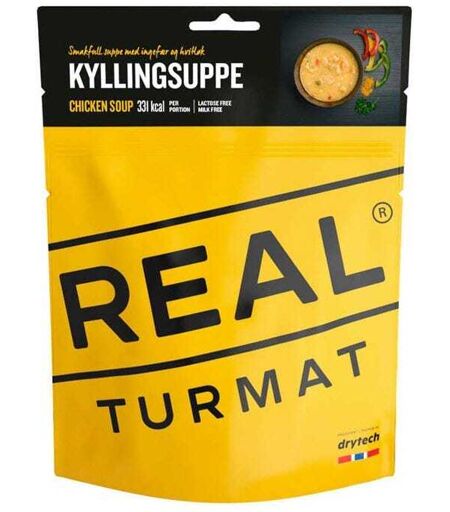 Real Turmat - Kyllingsuppe. Smakfull suppe med ingefær, hvitløk og store biter kyllingkjøtt. Ca. 370 gram mat, når ferdig tilbredt Real Turmat er smakfulle retter som passer for alle typer friluftsliv. Rask og enkel tilberedning, energi- og næringsrik turmat og god smak. 331 kcal pr porsjon. Allergener: Gluten og soya. Vekt: Netto: 59 gram. Brutto: 76 gram. Ferdig tilberedt: 370 gram. Holdbarhet: Produktet har 5 års holdbarhet fra produksjonsdato. Lagres ved romtemperatur. Åpen pose skal behandles som ferskvare. Måltidet bør spises innen 2 timer etter at vann er tilsatt. Tilberedning: Riv av toppen på posen ved rivehakket. Tilsett varmt vann (3,1 dl) til nivåmerket. Rør godt rundt, lukk posen med poselåsen og la retten hvile i 8 minutter. Ingredienser: Kylling (kylling (89%), salt, pepper, stabilisator (E450, E451)) (17%), kokosmelk, rapsolje, hvetemel, paprika (12%), løk, purreløk, soyasaus (soya, salt, eddik), limejuice, kyllingbuljong (aroma, gjærekstrakt, maltodekstrin, kylling, salt, løk, krydder), ingefær (1,4%), hvitløk (1%), krydder, karri (0,1%), persille (0,1%), antioksidant (askorbinsyre). Laktosefri og melkefri. ...