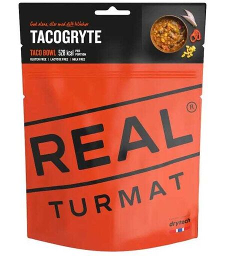 Real turmat Tacogryte. En god mulighet til å ta tacomiddagen ute i det fri. Real Turmat er smakfulle retter som passer for alle typer friluftsliv. Rask og enkel tilberedning, energi- og næringsrik turmat og god smak. 528 kcal pr porsjon. Allergener: selleri. Vekt: Netto: 111 gram Brutto: 128 gram. Ferdig tilberedt: 420 gram. Holdbarhet: Produktet har 5 års holdbarhet fra produksjonsdato. Lagres ved romtemperatur. Åpen pose skal behandles som ferskvare. Måltidet bør spises innen 2 timer etter at vann er tilsatt. Tilberedning: Riv av toppen på posen ved rivehakket. Tilsett varmt vann (3,1 dl) til nivåmerket. Rør godt rundt, lukk posen med poselåsen og la retten hvile i 8 minutter. Ingredienser: Tacokjøtt (storfekjøtt (60%), potetstivelse, krydder, salt, stabilisator (E451, E450), dekstrose (mais), antioksidant (E301, E392)) (21%), paprika (15%), tomat, bønner (13%), løk (8,5%), mais (5,3%), tomatpuré, rapsolje, purreløk, maisstivelse, selleri, tacokrydder (krydder, potetstivelse, antiklumpemiddel (silisiumdioksid)), kjøttbuljong (gjærekstrakt, maltodekstrin, salt, rapsolje, kjøttekstrakt, brunt sukker, løk), hvitløk, krydder, antioksidant (askorbinsyre). Glutenfri, laktosefri og melkefri. ...