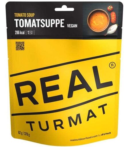 Real Turmat tomatsuppe. Tomatsuppe med klassisk smak av milde urter. En tidløs hjemmefavoritt som passer perfekt å ta med seg på tur. 286 kcal pr porsjon. Allergener: Gluten, Soya. Vekt: Netto: 62 gram. Brutto: 79 gram. Ferdig tilberedt: 370 gram. Holdbarhet: Produktet har 5 års holdbarhet fra produksjonsdato. Lagres ved romtemperatur. Åpen pose skal behandles som ferskvare. Måltidet bør spises innen 2 timer etter at vann er tilsatt. Tilberedning: Åpne posen ved øverste rivehakk. Tilsett 3,1 dl varmt vann som angitt. Rør om, lukk posen og vent i 8 minutter. Del posen ved nederste rivehakk og nyt. Ingredienser: Tomatpure, tomat, pasta (durumhvete), løk 12%, soyaprotein (98% soya, krydder, salt, rosmarinekstrakt), rapsolje, hvetemel, maisstivelse, soyasau (soya, salt, eddik),grønnsaksbuljong (salt, glukosesirup, aroma, løk, modifisert stivelse, maltodekstrin, rapsolje, grønnsakskonsentrat, krydder, sukker, eddikekstrakt), krydder, persille, oregano,antioksidant (rosmarinekstrakt, askorbinsyre). Laktosefri, melkefri, vegan, vegetar. ...