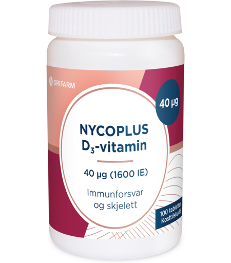 Nycoplus D3-vitamin 40 µg er et D-vitamintilskudd, godt for immunforsvaret og benbygningen. D-vitaminer øker kalsiumopptaket, gir god tannhelse, sterkere benstruktur og forebygger osteoporose (benskjørhet). D-vitaminer er viktig for aktiviseringen av immunforsvaret. Om kostholdet ditt ikke dekker det anbefalte inntaket av D-vitamin og du i tillegg er lite eksponert for sollys, kan det være hensiktsmessig å ta tilskudd regelmessig. Tilskuddene på 40 og 80 µg inneholder høyere konsentrasjon av D-vitamin og er beregnet for deg som kan ha behov for en høyere vitamindose. Tablettene er små og lette å svelge. Til voksne og barn over 11 år. Inneholder ikke gelatin, laktose, sitrus eller gluten. Egnet for vegetarianere. ...