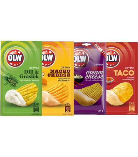OLW Dippmix Nacho Cheese selges i pose på 25 gram.ProduktinformasjonEn fyldig smak av meksikansk ost garanteres, og OLW leverer! Smaksløkene danser El Baile de Los Viejitos mens chipsen tar et dypp i den gyllengule røren – og ryktet sier at dippen funker like bra på tacos! Ingredienser: OSTEPULVER (ost-, myse- og KJERNEMELKPULVER), krydder (paprika, chilipepper, hvitløk, spisskummen, cayennepepper), fortykningsmiddel: E1412, tomatpulver, smaksforsterkere: natriumglutamat, sukker, salt, løkpulver, OSTEAROMA, vegetabilsk olje.OLW Dipmix Chili Cream Cheese selges i pose på 24 gram.Når man ikke trodde at chipsen kunde bli bedre, kom denne dippen og motbeviste det! Med et sting av chili er denne dippen perfekt for den som liker at det brenner litt på tungen, og kremosten runder av dippen og gir den en fullendt myk smak. Ingredienser: sukker, salt, MYSEPULVER (fra MELK), MELKEPULVER, modifisert stivelse, paprika, tomat, løk, gjærekstrakt, chilipepper, hvitløk, YOGHURTPULVER, cayennepepper, surhetsregulerende middel (melkesyre, sitronsyre), jalapeño, krydder, aroma, paprikaekstrakt.OLW Dipmiks Ramsløk 24gIngredienser: modifisert stivelse, salt, løk, sukker,melkesukker, maltodekstrin, melkepulver, persille, purreløk, ramsløk, gjærekstrakt, surhetsregulerende middelmelkesyre), aroma. Forandringer i produktinnholdet kan forekomme. Kontroller derfor alltid produktinformasjonen på originalemballasjen.OLW Dipmiks Fresh Island 24gIngredienser: Salt, modifierad stärkelse, socker, YOGHURTPULVER, paprika, lök, tomat, jästextrakt, maltodextrin, vitlök, svartpeppar, krydda, arom.Inneholder ca:Næringsinnhold Per 100 g:Energi 1300 (kJ)Energi 310 (kcal)Fett 2.6 g / hvorav mettede fettsyrer 1.2 gKarbohydrater 66 g Hvorav sokkerarter 27 g Protein 4.5 g Salt 17.8 g ...