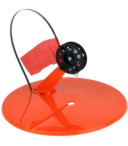 Wiggler Angeldon, ståsnøre til isfiske - komplett med flagg og spole. Settet består av en rund plastplate som du setter over ishullet. Platen er 26,5 cm i diameter og har et hull med skår for sena. Nappindikator-flagg og en stålfjær som er 38 cm lang. Flagget spennes opp mot spolen. Når det napper og spolen begynner å snurre, så går flagget opp og indikerer napp.Komplett med 20 meter sene, stålfortom med hempe og 8 grams søkke. ...