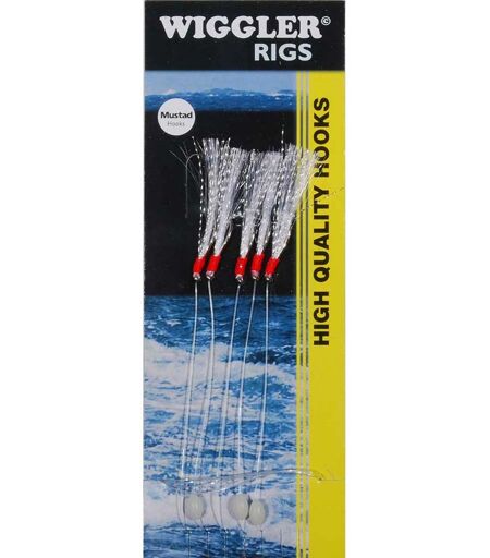 Wiggler Flasher 5 Rig hekle. Hekle med 5 kroker med sølv/glitter blinkende fjærmateriale, selvlysende perler og rød tråd som trigger fisken. Egner seg supert for fiske etter makrell, torsk, sild og sei. Spesifikasjoner: Krokstørrelse: 2. Senetykkelse 0,50 mm. Lengde 135 cm. ...