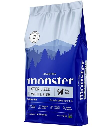 Monster Grain Free Sterilized White Fish Monster Grain Free Sterilized White Fish er et kornfritt helfôr spesielt utviklet for voksne steriliserte hunder. Dette næringsrike fôret bidrar til å opprettholde en sunn vekt og støtter god fordøyelse.Fôret er rikt på hvit fisk, en naturlig proteinkilde med høyt omega-3-innhold, som bidrar til en sunn hud og blank pels. Det er optimalisert for vektkontroll og inneholder ingredienser som bidrar til at hunden din omdanner fett til energi. Hvit fisk som eneste proteinkilde Kornfritt og glutenfritt Rikt på omega-3 for en sunn pels Inneholder L-karnitin for vektkontroll ...