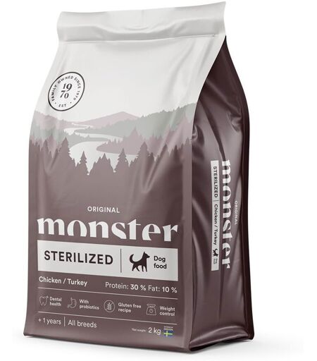 Monster Dog Original Sterilized All Breed Chicken & Turkey Monster Dog Original Sterilized All Breed Chicken & Turkey er et fullfôr som er tilpasset for voksne kastrerte hunder fra 1 års alder. Fôret kan også passe for hunder som trenger litt hjelp med å holde vekten. Et glutenfritt hundefôr av superpremium kvalitet, med kylling- og kalkunsmak som hovedingredienser. Har du en matglad hund? Eller har den firbeinte vennen din lett for å gå opp i vekt? Monster Dog Original Sterilized er utviklet med hensyn til alle hunder som – av ulike grunner – kan trenge å kontrollere vekten sin. Selvfølgelig uten å kompromisse med den nydelige smaken eller den høye kvaliteten. Monster Dog Original Sterilized inneholder rikelige mengder med kylling og kalkun, samtidig som det inneholder viktige komponenter for sunn vekt. Med Monster Dog Original Sterilized kan hunden din få nyte det hellige måltidet sitt og fortsatt føle seg bra. Hver dag. Fersk kylling som hovedingrediens. Animalsk protein som bygger opp sterke og slanke muskler. Vektkontroll med L-karnitin og et høyt proteininnhold – for naturlig fettforbrenning og opprettholdelse av muskelmasse. Lavt fettinnhold – bare 10 % fett. Glutenfri oppskrift – for å redusere risikoen for følsomhet. Tips! Vei maten for å få riktig mengde. ...