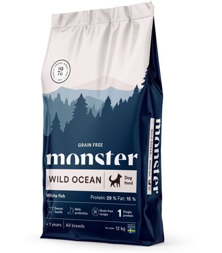 Monster Dog Grain Free Wild Ocean Monster Dog Grain Free Wild Ocean All breed er et fullfôr som er tilpasset for sensitive voksne hunder av alle raser, fra 1 års alder. Dette er et kornfritt hundefôr av superpremium kvalitet, med hvit fisk som hovedingrediens! Har du en en sensitiv hund eller vil du bare at pelsen skal få litt ekstra glans og glød? Monster Dog Grain Free Wild Ocean er rik på næringsrik hvit fisk og sunn fiskeolje – naturlige kilder til Omega-3. Oppskriften er kornfri og inneholder bare en proteinkilde, for en ekstra skånsom oppskrift. Fôret er selvfølgelig også fri for unødvendige tilsetningsstoffer. Og vi tør nesten love at hunden din kommer til å elske smaken! Hvit fisk som eneste proteinkilde – skånsom proteinkilde som forekomsten dannelsen av følsomhet. 100 % kornfritt – og fri for andre unødvendige tilsetningsstoffer. Skånsom oppskrift – lett fordøyelig og inneholder blant annet probiotika som er snill mot magen og bidrar til sunn fordøyelse. En frisk mage og tarm styrker også immunforsvaret hos hunden din. Frisk hud og pels – med optimal Omega 3-og Omega 6-balanse. Tannsteinkontroll – inneholder mineraler og har sprø fôrkuler som reduserer plakk og dannelsen av tannstein. For sterke tenner og et friskt tannkjøtt. ...