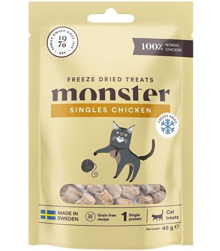Monster Cat Treats Freeze Dried ChickenPosen inneholder 45 gram med kattegodbiter! Av og til går ikke alt som planlagt. En trykkfeil på posen sier at den inneholder 40 g. Dette er ikke korrekt. Lekre kattegodbiter av deilig, frysetørret kylling? Ja, takk! Disse godbitene av 100 % kylling kommer nok til gi vann i munnen til pusekatten der hjemme! Takket være den skånsomme frysetørkingsprosessen har bitene bevart sin naturlige smak. Noe en sann kjøtteter pleier å sette pris på! Monster Cat Treats Freese Dried Chicken er laget av nordisk kylling, og er dessuten produsert i Sverige! Bitene kommer uten unødvendige tilsetningsstoffer og er laget av kun en ingrediens, slik at du kan være helt sikker på hva katten får i seg. Åpne posen og skjem bort pusen med noen deilige godbiter. Vi vet at katten din fortjener det! Frysetørket kattegodbit av 100 % kylling Fra dyr avlet i Norden Produsert i Sverige Ingen unødvendige tilsetningsstoffer Velsmakende kjøttkonsistens takket være en skånsom produksjonsprosess ...