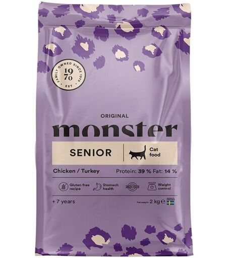 Tørrfôr for eldre katter: Monster Cat Original Senior Chicken Turkey Monster Cat Original Senior Kylling-Kalkun er spesielt tilpasset for eldre katter og gir dem alt de trenger for å holde seg friske og aktive. Fersk kylling og kalkun er hovedingrediensene, som gir katten din den næringen den trenger for å opprettholde en sunn vekt og muskulatur. Kjøttinnholdet er høyt, noe som sørger for at katten din får nok protein. Omega-fettsyrer bidrar til å holde kattens pels og hud i god kondisjon. Dette kattefôret er også fri for kunstige tilsetningsstoffer og smaksstoffer. Det finnes to størrelser på fôrposene: 2 og 6 kg ...