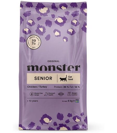 Tørrfôr for eldre katter: Monster Cat Original Senior Chicken Turkey Monster Cat Original Senior Kylling-Kalkun er spesielt tilpasset for eldre katter og gir dem alt de trenger for å holde seg friske og aktive. Fersk kylling og kalkun er hovedingrediensene, som gir katten din den næringen den trenger for å opprettholde en sunn vekt og muskulatur. Kjøttinnholdet er høyt, noe som sørger for at katten din får nok protein. Omega-fettsyrer bidrar til å holde kattens pels og hud i god kondisjon. Dette kattefôret er også fri for kunstige tilsetningsstoffer og smaksstoffer. Det finnes to størrelser på fôrposene: 2 og 6 kg ...