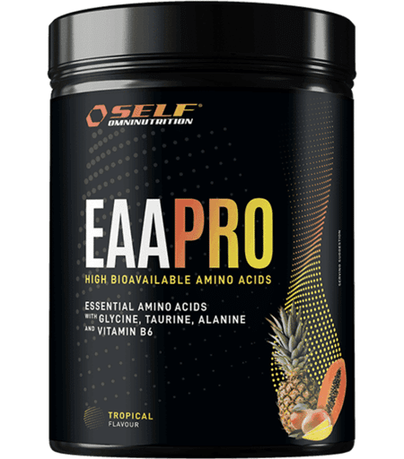EAA Pro fra Self inneholder alle de 8 essensielle aminosyrene som kroppen ikke kan produsere selv!Dette er aminosyrene som er byggesteinene i proteiner og som blandt annet brukes til å bygge opp muskelvev. Kroppen kan produsere noen aminosyrer selv, men disse 8 essensielle aminosyrene må kroppen få i seg via kosthold.Nå kan du endelig få et komplett EAA produkt som har god effekt og som i tillegg smaker godt. EAA aminosyrene bidrar positivt til flere funsksjoner enn å være muskeloppbyggende og bedre restitusjon. Det er også slik at aminosyrene bidrar til å produsere enzymer og kan ha positive virkning på søvn, konsentrasjon og tretthet. En publisert studie sier at regelmessig inntak av aminosyrer bidrar til å forhindre akkumulering av bukfett hos kvinner etter overgangsalder. En fordel med dette produktet i forbindelse med lavt kaloriinntak er mer betydelig vekttap sammenlignet med mat alene. Disse aminosyrene hjelper prosessen med å bygge muskler, men er også til stor hjelp for å beholde muskelmassen for folk som ikke driver med sport. En studie publisert i “Journal of Nutrition” indikerer at den fremmer positiv resulterende effekt på VO2max (maksimalt oksygenforbruk), som var høyest hos de menneskene som hadde fått aminosyretilskudd sammenlignet med placebo.Hvorfor velge EAA Pro:- Reduserer nedbryting av muskler- Inneholder alle 8 essensielle aminosyrer!- Hjelper muskelbygging- Forhindrer ansamlig av magefettInnhold:400gAnbefalt dosering:Rett etter trening. Bland 16 g med 4 dl vann, øk eller minimer mengde vann for sterkere eller mildere smak.Næringsinnhold:NæringsinnholdPer 100 gPer 16 gEnergi0 kcal0 kcalFett0 g0 g - hvorav mettet0 g0 gKarbohydrater0 g0 g - hvorav sukker0 g0 gProtein0 g0 gSalt0,1 g0,016 g IngredienserL-Leucin4000 mgGlycin2000 mgL-Lysin1950 mgL-Theronin1570 mgL-Alanin1000 mgTaurin1000 mgL-Histidin600 mgL-Fenylalanin600 mgL-Valin500 mgL-Isoleucin500 mgL-Tryptofan220 mgL-Metionin210 mgIngredienser Tropical flavour: Syre (E296), antiklumpemiddel (E551, E552), aroma, antioksidant (E341), søtningsmiddel (E955,E950), farge (E160a). Kan inneholde spor av melk, havre, egg og soya. Ingredienser Orange flavour: Syre (E296), antiklumpemiddel (E551, E552), aroma, antioksidant (E341), søtningsmiddel (E955,E950), farge (E160a). Kan inneholde spor av melk, havre, egg og soya. NB: Bør ikke brukes av personer som tar antidepressiva.Må ikke brukes hvis lokk eller sikkerhetssegl er brutt/mangler. Dette kosttilskuddet skal kun brukes av voksne. Anbefalt dosering bør ikke overskrides. Oppbevares på en tørr, mørk og kjølig plass utilgjengelig for barn. Bør ikke utsettes for direkte sollys. Ikke beregnet for barn under 18 år, kvinner som er gravide eller ammende. Rådfør deg med legen din før bruk av dette produkter hvis du bruker medisiner eller har en medisinsk tilstand. Kosttilskudd bør ikke brukes som en erstatning for et variert kosthold. ...