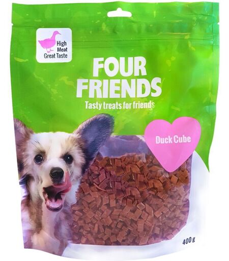FourFriends Dog Duck Cube Deilige hundegodbiter i passelig store biter til trening, fredagskos eller tursnacks. Siden bitene er så små og lette å tygge på, passer de også utmerket til små hunder! Godbitene består av 80 % and, noe som gir en deilig smak som vi tviler på at hunden din klarer å motstå! FourFriends Dog Duck Cube kommer i en gjenlukkbar pose som sørger for at godbitene holder seg ferske! Husk at godbiter aldri er et alternativ til et balansert kosthold – det skal alltid gis ved siden av som en bonus eller belønning. Uansett hvor glad din firbeinte venn er i godbiter, er det du som eier som er ansvarlig for at den holder seg frisk og rask. Les anbefalingene på forpakningen, og husk at alle dyr er individer – tilpass inntaket etter hva som passer nettopp din venn! ...