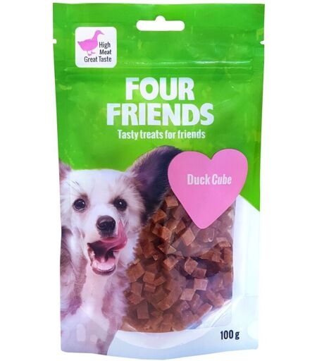 FourFriends Dog Duck Cube Deilige hundegodbiter i passelig store biter til trening, fredagskos eller tursnacks. Siden bitene er så små og lette å tygge på, passer de også utmerket til små hunder! Godbitene består av 80 % and, noe som gir en deilig smak som vi tviler på at hunden din klarer å motstå! FourFriends Dog Duck Cube kommer i en gjenlukkbar pose som sørger for at godbitene holder seg ferske! Husk at godbiter aldri er et alternativ til et balansert kosthold – det skal alltid gis ved siden av som en bonus eller belønning. Uansett hvor glad din firbeinte venn er i godbiter, er det du som eier som er ansvarlig for at den holder seg frisk og rask. Les anbefalingene på forpakningen, og husk at alle dyr er individer – tilpass inntaket etter hva som passer nettopp din venn! ...
