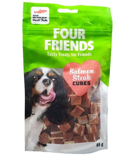 FourFriends Salmon Steak Cubes Disse herlige hundegodbitene er formet som små, myke kuber og passer for hunder i alle størrelser! Godbitene er lette å tygge på og har en deilig smak av laks! FourFriends Salmon Steak Cubes inneholder 72 % laks, noe som gir en dyp og herlig smak som vi tror hunden din vil elske! Takket være de små bitene passer de utmerket som belønning under trening eller lufteturer. Godbitene kommer i en gjenlukkbar pose, slik at de holder seg like myke og ferske hver gang! Husk at godbiter aldri er et alternativ til et balansert kosthold – det skal alltid gis ved siden av som en bonus eller belønning. Uansett hvor glad din firbeinte venn er i godbiter, er det du som eier som er ansvarlig for at den holder seg frisk og rask. Les anbefalingene på forpakningen, og husk at alle dyr er individer – tilpass inntaket etter hva som passer nettopp din venn! ...