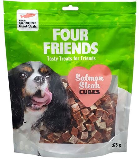 FourFriends Salmon Steak Cubes Disse herlige hundegodbitene er formet som små, myke kuber og passer for hunder i alle størrelser! Godbitene er lette å tygge på og har en deilig smak av laks! FourFriends Salmon Steak Cubes inneholder 72 % laks, noe som gir en dyp og herlig smak som vi tror hunden din vil elske! Takket være de små bitene passer de utmerket som belønning under trening eller lufteturer. Godbitene kommer i en gjenlukkbar pose, slik at de holder seg like myke og ferske hver gang! Husk at godbiter aldri er et alternativ til et balansert kosthold – det skal alltid gis ved siden av som en bonus eller belønning. Uansett hvor glad din firbeinte venn er i godbiter, er det du som eier som er ansvarlig for at den holder seg frisk og rask. Les anbefalingene på forpakningen, og husk at alle dyr er individer – tilpass inntaket etter hva som passer nettopp din venn! ...