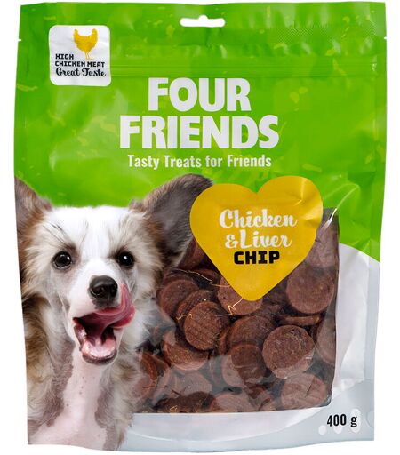 Four Friends kylling- og levergodbiter - 400 gBelønningsgodbiter av høy kvalitet. FourFriends Chicken & Liver Chip er en belønning med høyt kjøttinnhold av kylling og lever. Kan brytes i mindre biter eller gis som den er. En flott smaksopplevelse for hunden. Emballasjen er gjenlukkbar. Sammensetning Kyllingkjøtt 75 %, lever 5 %, stivelse. Analytiske bestanddeler Protein 32 %.Fett 2 %.Fiber 0,1 %.Aske 5Vann 23 ...