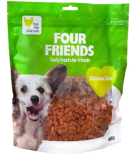 FourFriends Dog Chicken Cube Denne deilige hundesnacksen kommer i småbiter med smak av kylling. Bitene er lette å tygge og passer som belønningsgodbit selv for de minste rasene. Godbitene består av 80 % kylling, noe som skaper en uimotståelig smaksopplevelse for hunden din! FourFriends Dog Chicken Cube kommer i en gjenlukkbar pose som sørger for at godbitene holder seg myke og friske. Husk at snacks aldri er et alternativ til et balansert kosthold – det skal alltid gis ved siden av som en bonus eller belønning. Uansett hvor glad din firbeinte venn er i godbiter, er det du som eier som er ansvarlig for at den holder seg frisk og rask. Les anbefalingene på forpakningen, og husk at alle dyr er individer – tilpass inntaket etter hva som passer nettopp din venn! ...