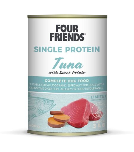 Four Friends Dog Single Protein Tuna 400 g Dette velsmakende hundefôret inneholder tunfisk og søtpotet – en kombinasjon som gir en fantastisk smak, og som pleier å passe utmerket til hunder med allergier eller sensitiv mage. Dette er et såkalt singelproteinfôr – det betyr at fôret kun inneholder én animalsk proteinkilde. Dette fôret inneholder tunfisk, en smaksrik og høyt elsket ingrediens. Fôret er fritt for kornprodukter. Karbohydratene kommer i stedet for det meste fra søtpotet. Søtpotet er en hypoallergen ingrediens som er lett å fordøye og som blir en stadig mer vanlig ingrediens både i hundefôr og i vår egen mat. Four Friends Dog Single Protein Tuna kan gis som fullfôr, men passer også fint som et komplement til tørrfôr. Våtfôret er beriket med lakseolje, som tilfører sunne fettsyrer som er bra for hud og pels! Uåpnet boks oppbevares i romtemperatur. Når boksen er åpnet, holder fôret seg i ca. 2–3 dager. ...