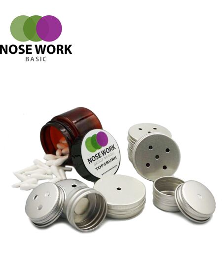 NoseWork-beholdersett 2Et beholdersett fra Nose Work som inneholder aluminiumsbeholdere i forskjellige størrelser og med forskjellig antall hull. Brukes ved å slippe en av Nose Works-duftene på et topphode, og deretter plassere topphodet i beholderen. Hunden får da øve på å søke etter duften. Merk! Brukes med forsiktighet da neodymmagneter er veldig sterke. Settet inneholder følgende produkter: • 3 x Beholder Liten med 5 hull • 1 x Beholder Liten med 1 hull • 2 x Container Mini med 3 hull • 1 x Minibeholder med 1 hull • 1 x Topsburk Hva er Nosework? Nosework er en sport som passer alle hunder, uavhengig av rase, alder eller tidligere erfaring! Sporten handler om å søke etter en viss... ...
