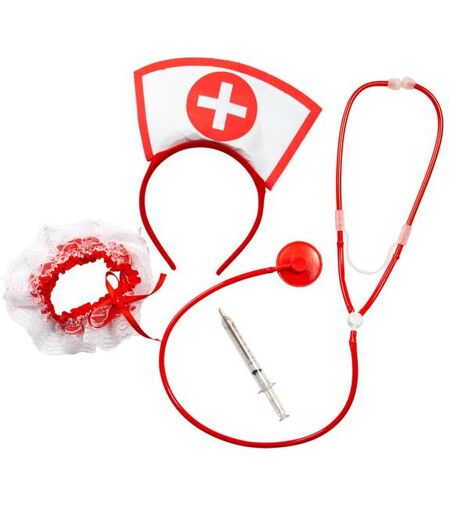 Sykehus Tilbehørskit inkluderer et rødt diadem med hvitt stoff og et rødt trykk på, et rødt stetoskop i plast, en penn som ser ut som en sprøyte med blod samt et rødt/hvitt strømpebånd med blonder og en rød sløyfe på.One size (voksenstørrelse). ...