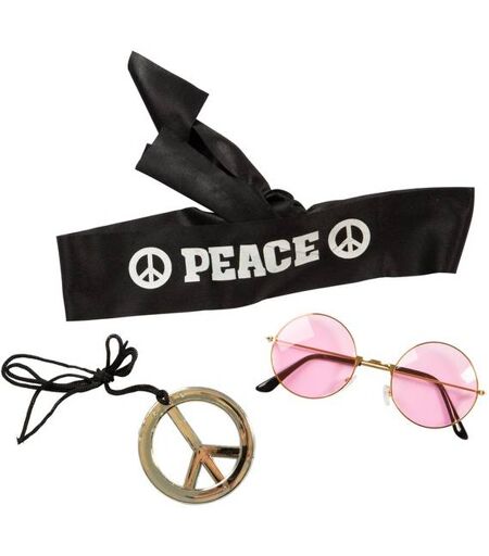 Skal du være hippie? Her har du tilbehøret.I denne pakken får du med smykke med sølvfarget fredstegn, runde briller med rosa glass og svart hodebånd med teksten ''Peace''. ...