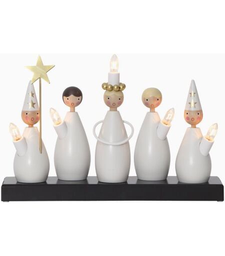Star Trading lysestake Lucia kor hvit. inkl. glødepærer. En fin lysestake av tre med Lucia, to terner og to stjerners gutter, en stjernegutt som holder en malt gullstjerne i metall. Lucian har en gullkrans av malte trekuler. 5 glødepærer er inkludert. Plasser lysestaken på en skjenk eller i en veranda for å spre en nydelig julestemning i hjemmet ditt. ...