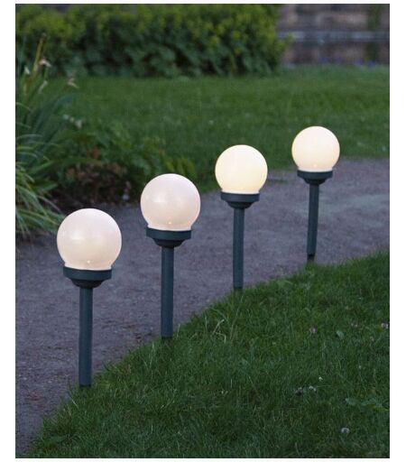 En 4-pakke med soldrevne globus som er 10 cm i diameter og er 27 cm høye. De lyser med en varm hvit glød i mørket. »Montering ...