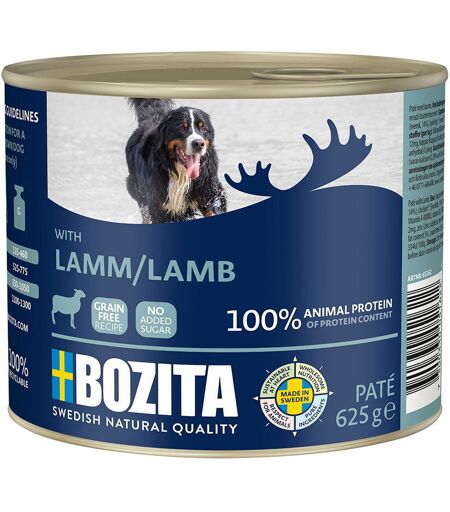Egenskaper Bozita Lam, Paté er et svensktilvirket, velsmakende helfôr med en stor andel svenske råvarer. 14 % lam og det er laget uten sukker, soya eller fargestoffer. Mating Se detaljert matrasjon på forpakningen. Bruk Våtfôr for hunder ...