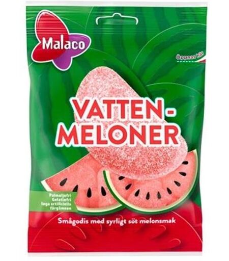 Malaco Vattenmeloner 90g De er allerede en klassiker innen løsvektsmågodt, og nå kan du nyte dem maksimalt med en hel pose til rådighet. Vattenmeloner i Pose er sur vingummi som smaker som søt melon. Selges i poser på 70 g.EAN: 7310350136995Se relaterte produkter for vårt utvalg av Malaco og Haribo. ...