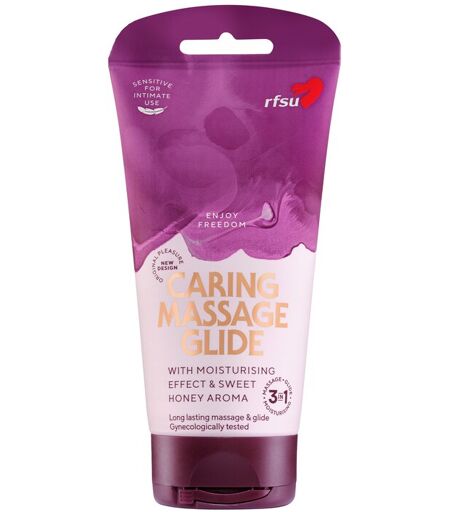 Rfsu Caring Massage Glide er et fuktighetsgivende og vannbasert glidemiddel som også kan brukes til sensuell massasje. Rfsu Caring Massage Glide er tre produkter i ett! Den fungerer både som et vannbasert glidemiddel, men kan også brukes som massasjegel for intime øyeblikk. Glidemiddelet har ekstra fuktighetsgivende egenskaper, er parfymert for å stimulere sansene samt spiselig med en litt søtlig smak. Dette glidemiddelet kan gjøre den sensuelle opplevelsen enda mer intens med smak, duft, fuktighet og perfekt glid – perfekt til forspill. Kan brukes med eller uten kondom og på sexleketøy. Kan også brukes ved oralsex. ...